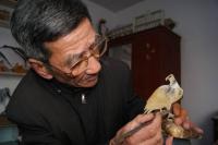 初見苑德云,以為他才60多歲,沒想到他已經72歲了。跟隨這個慈善老者走進他的工作室,只見整個墻架上擺滿了各種各樣的雕刻品,特別是一件件牛角雕成的仙鶴,或覓食,或高歌,或輕語,高蹈優雅,姿態靈活,惟妙惟肖。
